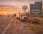 Car wrecks are among the most common cases we handle for Shawnee clients. I-40 through northern Shawnee sees significant commercial traffic, and accidents near the Harrison Street, Kickapoo Street, and Shawnee Mall Drive interchanges are a consistent source of serious injury claims in this corridor. Truck accidents along I-40 through Pottawatomie County can be catastrophic — involving commercial carriers, logistics companies, and insurance teams that move quickly to limit liability after a crash. Slip and fall injuries happen regularly at Shawnee Mall, retail locations along Harrison Street and Federal Street, grocery stores throughout the city, and at the Heart of Oklahoma Expo Center during events.